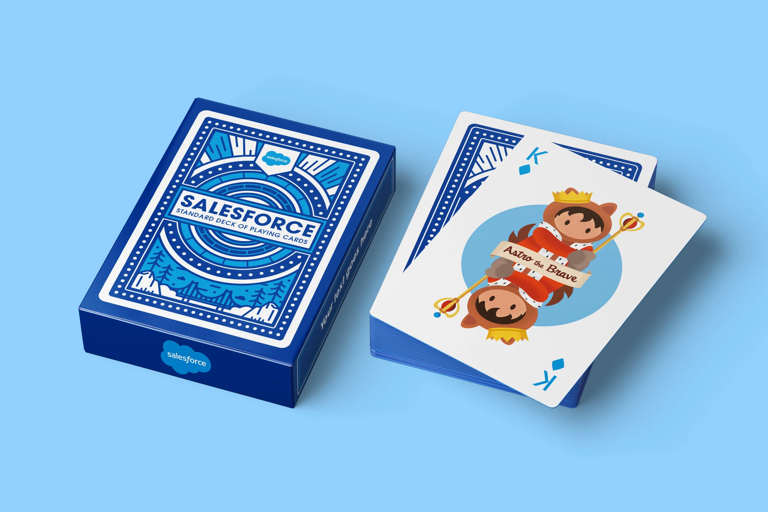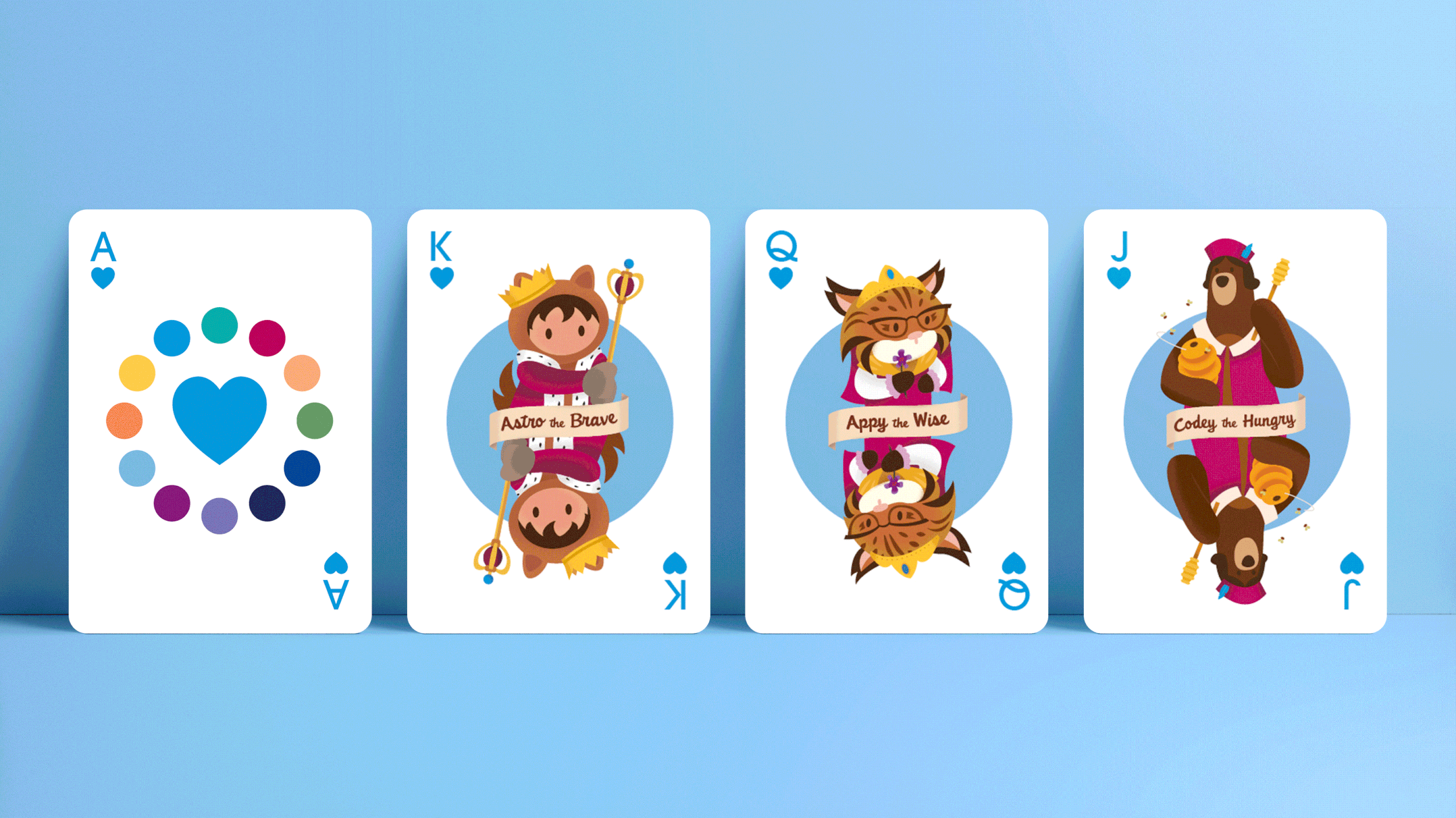 These playing cards were designed to support an activity at a digital event for Salesforce, Switzerland. I leveraged our line art style for the box and card reverse designs in a nod to traditional card packs. For the suits, I used our corporate colours and bit of illustration manipulation to create the royal-themed characters. Unfortunately, they were never produced for that specific event, but I live in hope that the designs will be used in the future.